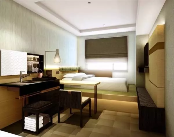 客室のカーペットやインテリアは、木目と緑茶をイメージしたやわらかいグリーンを基調に。「スーペリアダブルB -ENGAWA-」など35室は、その名の通り「茶屋の縁側」をモチーフにした家具を設置。また、客室のベッド側半分の床全体を約40cm高くすることで、茶屋の縁側のように腰をかけてくつろぐ事が出来るほか、お茶をその場で淹れられるよう、一部の部屋では洗面台をベッドルーム側のデスク横に配置しているのも、他のホテルにはない珍しい特長となっている。