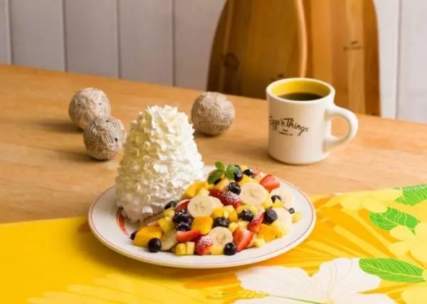 新しい年を祝う「ハウオリフルーツパンケーキ」は、ストロベリー、ブルーベリー、バナナ、パイナップル、マンゴーといった5種類のフルーツをたっぷりと盛りつけたトロピカルな味わいを楽しめるパンケーキ。新春らしく彩り鮮やかで、幸福感いっぱいのパンケーキに仕上げている。