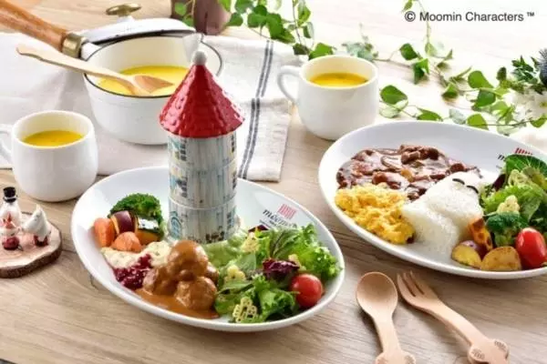 ランチタイムメニューには毎日数量限定の「ムーミンハウスの欲張りプレート」や、「ムーミンプレート」が登場。「ムーミンハウスの欲張りプレート」は、ムーミンハウスの3段ココット、北欧ミートボール、サラダ、季節の温野菜3種がセット。さらにお土産として、8種類から選べるムーミンキャラクターたちの陶器マスコットを持ち帰ることができる。