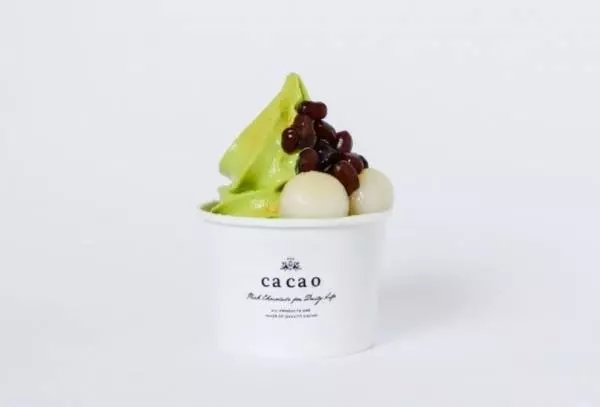 今回そんな「カカオ」が新たに提案するのは、カカオ分36%のスッキリとしたホワイトチョコレートに京都宇治の抹茶をたっぷりとブレンドした抹茶ソフト。仕上げにモチモチ食感の白玉、抹茶を引き立てる名脇役のあんこを添えた、冬限定の贅沢な一品だ。