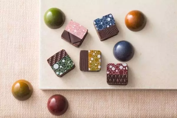 みずみずしい果実をイメージした艶やかな「ボンボンショコラ~フルーツとのアルモニー~」は葡萄やベリー、シトラスなどがフレッシュにはじける5つのフレーバーを楽しむことができる。