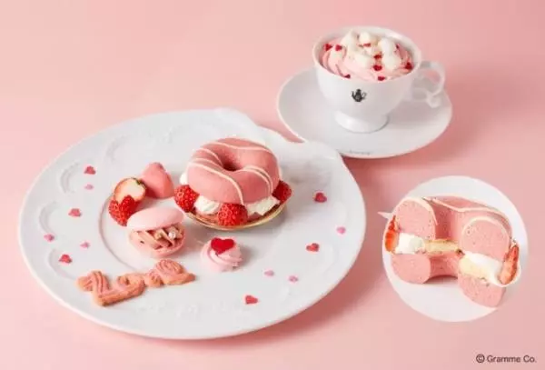 「ラブ ドーナッツ プレート」は、ドーナツとラブハートホイップのアクセサリーをモチーフに。プレートはホイップクリームに新鮮な苺が贅沢にサンドされたドーナッツをメインに、ハートゼリーがのったホイップクリーム、ピンクのハート型ショコラ、「LOVE」の文字をかたどったクッキーなどを並べている。