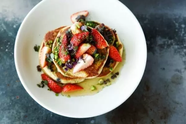 ストロベリーのフレッシュな酸味に、ピスタチオは香ばしくまろやかな甘みをプラス。シソ(ムラメ)はスパイスとして程よく全体の味を引き締める役割を果たし、奥深い味わいに。ベリーが練り込まれた自家製ベリーバターやメープルシロップと合わせて食べると、素材一つ一つの味わいが生き、ベリーの魅力がより引き立つパンケーキとなっている。