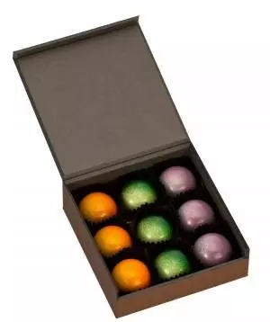 鮮やかなオレンジの「オランジュ アブリコ」は、バニラガナシュに、フレッシュオレンジとドライアプリコットのコンフィチュールを合わせた。ダークグリーンの「テ オ レ」は、アールグレイティーが香るミルクガナシュを、スイートチョコレートで包み込んでいる。パープルの「カシス レザン」は、ぶどうガナシュにカシスのコンフィチュールが合わさった、フルーティなぶどうの香りと、カシスの果実味が特徴のショコラだ。