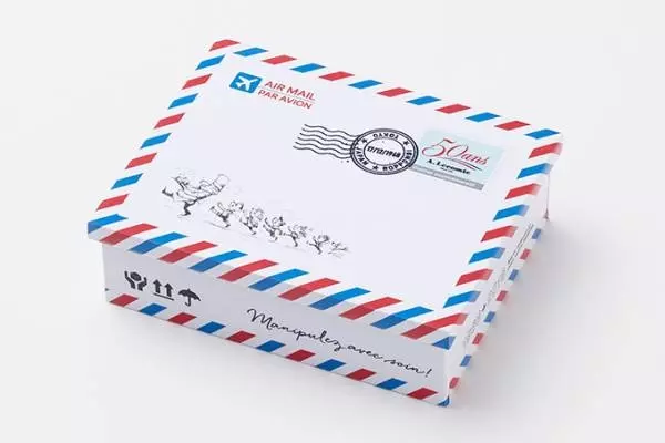 展開されるのは、創業50周年を記念して作られたデザイン缶2種類。1つはトリコロールカラーの国際郵便の封筒をモチーフにしたデザインだ。洋菓子を抱えるパティシエとその香りに魅了されて後を追う子どもたちの姿、そして50周年記念のロゴがあしらわれている。