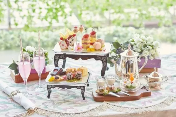 アフタヌーンティーは、見た目にも愛らしいスイーツやフィンガーフードが登場。水色からピンクへと色が変わる、まるで魔法のようなドリンク「不思議なマローブルーのレモネード」からティータイムがスタート。飛び出たうさみみが愛らしい「うさみみチョコと真っ赤なバラのチョコムース」、いちごと濃厚なクリームをふんだんに使用した「アリスの森のフレジェ」など、アリスの世界観を表現したファンタジーなスイーツを楽しめる。