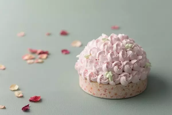 新作スイーツには、ギフトとしても最適な、華やかな見た目のラインナップを揃えた。「⺟の⽇フラワーケーキ」は、ブーケのようなビジュアルのドーム型ケーキ。淡いピンクに彩られた花びらは、バタークリームで繊細に表現されている。