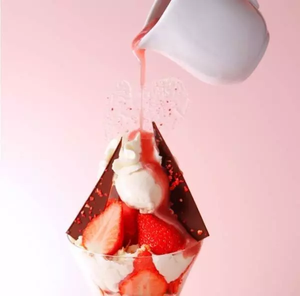 ショコラティエ パレ ド オールからいちごソースを注いで味わう春限定パフェ