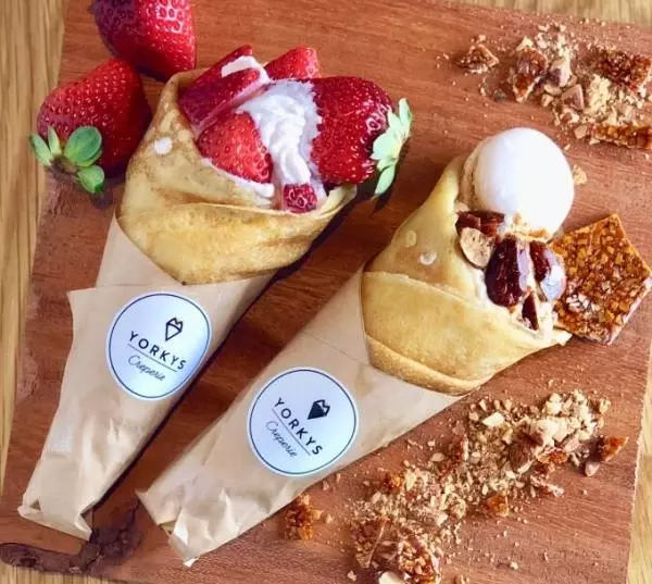 パンケーキの生地を改良して作られたクレープは、徹底的にこだわった温度と製法による独特の食感が特徴。"パンケーキを知り尽くしたヨーキーズだからこそ作れるクレープ"を掲げ、オリジナルのもちもちのクレープに仕上げた。