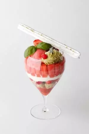 鮮やかな色合いの「大人パフェ」は、パフェの定番である苺をたっぷりと使いつつも、ジャムなどに用いられる酸味が特徴の野菜・ルバーブ、香り高いバジリコを合わせることで、今までに食べたことのない新鮮な味わいに仕上がっている。甘酸っぱい風味の中に、まろやかなフロマージュの奥行きも感じられる洗練された大人のための一品だ。