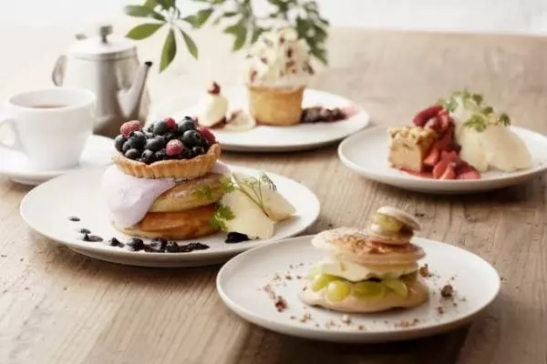 パンケーキの上にタルトを載せた大胆な1品も。「ブルーベリーとブルーベリークリームのタルトパンケーキ」は、たっぷりのブルーベリー、ブラックベリー、フランボワーズのタルトに甘酸っぱいブルーベリークリームやソースを加えて仕上げている。爽やかなブルーベリーの味わいを存分に堪能できる。その他、マカロンにマスカットやバニラアイスをサンドしたスイーツや、フレッシュなストロベリーやミルククリームを合わせたクランブルケーキなど、贅沢な味わいのスイーツが揃う。