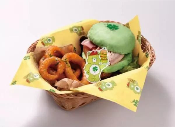 「ケアベアカフェ」では、「ケアベア」の愛らしい表情やイメージカラー、シンボルマークを随所に取り入れたフードやドリンクを提供。「グッドラックベアのグッドラックハンバーガー」は、グリーンのバンズにクローバーをあしらったハンバーガー。オニオンリングとともに味わうことができる。