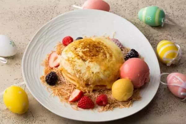 「イースターエッグ ブリュレパン ケーキ 苺とマンゴーアイス」は、イースターのシンボル"たまご"の断面をイメージして、パンケーキにアレンジを加えたメニュー。アーモンド風味のパンケーキの周りには、ココナッツをあしらい"鳥の巣"を表現している。アイスクリームやフレッシュベリーをプレートに飾ったことで、華やかなビジュアルに仕上げた。