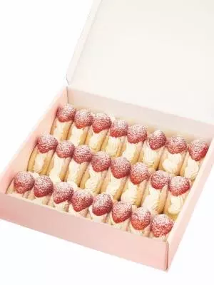 看板商品である「オムレット」は、オムレツをイメージした生地にたっぷりとホイップクリームを挟み、様々なフルーツやトッピングで飾ったスイーツ。フレッシュなイチゴや抹茶、チョコレート、きなこなど全6種の味を用意する。また、それぞれ4個入り、12個入り、24個入りを販売。ベビーピンクやライトグリーンの箱に隙間なく詰められた「オムレット」は、ギフトにもぴったりの1品だ。