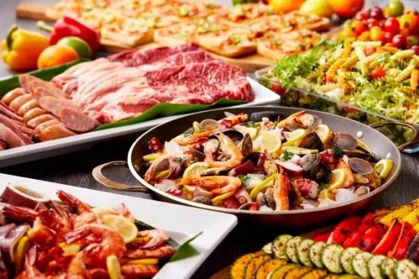 シェフがグリルするバーベキュー(ビーフ・ポーク・ソーセージ)/魚介類のパエリア/フォカッチャピザ/ニース風サラダ/ショートパスタサラダ/ライスサラダ/グリル野菜/チキン手羽の香草焼き/アヒージョ/ツナのペンネ/ポテトのボロネーゼ/黒カレー/マリネ/ピクルス/オイルサーディンなど約40種