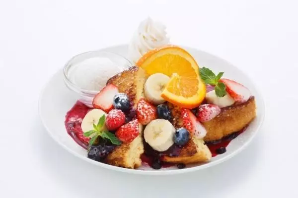 こだわりのオリジナルパンで作ったフレンチトーストにクリームチーズをサンドし、ベリー類やバナナ、オレンジ等のフレッシュフルーツとホイップホイップクリーム、ジャージー牛乳アイスを飾った「ベリーDX」や、チーズを混ぜて仕上げたフレンチトーストと半熟卵を絡めて食べる「エッグベネディクト」など、見た目にも華やかで食べ応え満点のメニューが揃う。