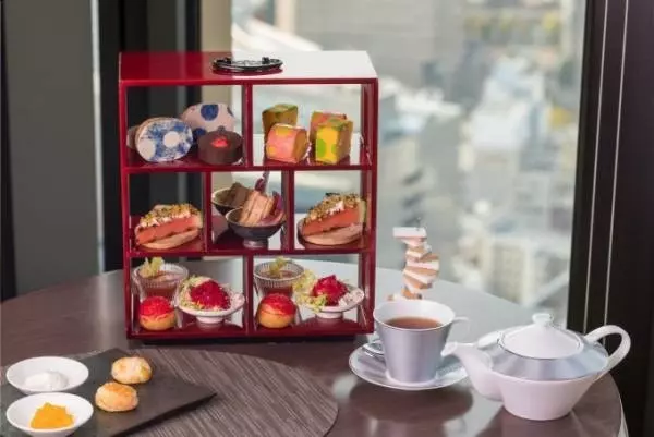 エグゼクティブ・ペストリーシェフ ファビオ・バルディが手掛ける、夏らしい"水玉"をテーマにした「ドットフル・アフタヌーンティー」。店内では、"ドット"と"カラフル"を合わせた"ドットフル"をテーマにしたデザート6種と、軽食4種の計10種のメニューを、和箪笥をモチーフにしたモダンなティースタンドに入れて提供する。