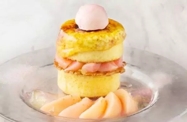 パンケーキとパンケーキの間には、旬の桃とカスタードクリームをサンド。トップには香ばしくキャラメリゼしたクレームブリュレと桃のシャーベットをのせて、華やかな見た目に仕上げた。