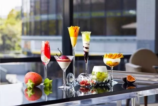 注目は、フルーツやジュレ、カラフルなソースを重ねたグラスデザート「ヴェリーヌ」。マスカットのモヒート風や、トマト&バジルクリームの前菜風など全7種類を食べ比べることができる。また、桃を使ったタルト・ロールケーキ・ピーチメルバ、西洋すもも「ミラベル&クエッチ」のタルト、パイナップルのプディング、メロンシュークリーム、レモンタルトなど季節のフルーツをふんだんに使用したスイーツの数々を味わうことができる。