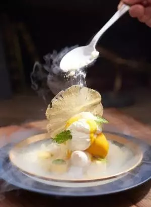 運ばれてきたパフェには、液体窒素を使用して-196℃に冷やしたパウダー状のグラニテをトッピング。白い煙がモクモクと立ち込める幻想的な演出と共に、表面が凍るほどの冷たさに変化したスイーツが現れる。