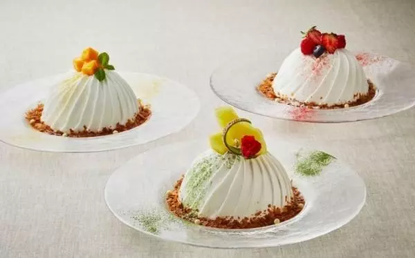 「スノードームケーキ」は、クリーミーな生クリームを組み合わせた新食感のカキ氷。ケーキのようなドーム型のスイーツの中には、さくさく&ふわふわのかき氷をセット。氷の上には、フレッシュなフルーツと果肉をピューレ状にしたジュレを重ねた。その上から、甘さ控えめに仕上げた生クリームを贅沢にあしらい、かき氷を包み込んだ。