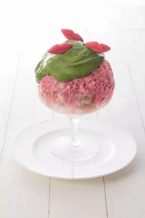 スイスホテル南海大阪「宇治抹茶フランボワーズショコラ氷」リップ型チョコをトッピングした限定かき氷
