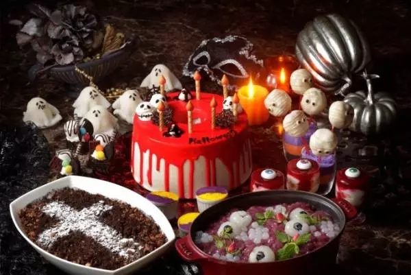 骸骨をデコレーションした「ハロウィンバースデーケーキ」や、十字架をあしらった「死者のティラミス」、魔女が魔法の薬を作るような怪しい鍋をイメージした「地獄のドロドロジュレ」、シュークリームをチョコレートでコーティングして包帯ぐるぐる巻きのミイラに仕上げた「ミイラのシューポップ」などを並べる。