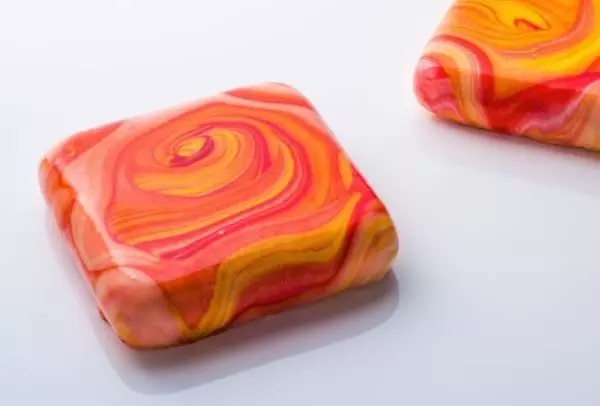 ピーチとラズベリーでマーブル模様を描いた艶やかなコーティングのケーキには、なめらかなムースとサクサク食感のクランチを閉じ込めている。カカオ68%の濃厚なチョコレートムースには鮮やかなパイナップルゼリーを飾った。