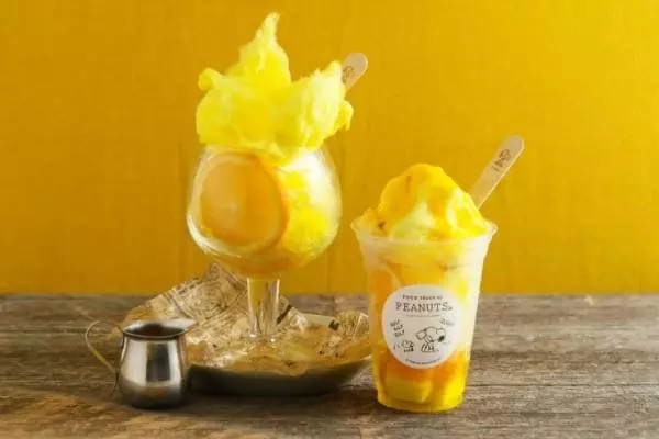 「ウッドストックのかき氷」は、レモンシロップで爽やかに仕上げたかき氷に、フローズンマンゴーとパイナップル、オレンジを合わせた、ウッドストックカラーの見た目にも涼しげなスイーツ。かき氷の上にレモンフレーバーのふわふわコットンキャンディーをトッピングして表現した、ウッドストックの特徴的なシルエットに注目だ。