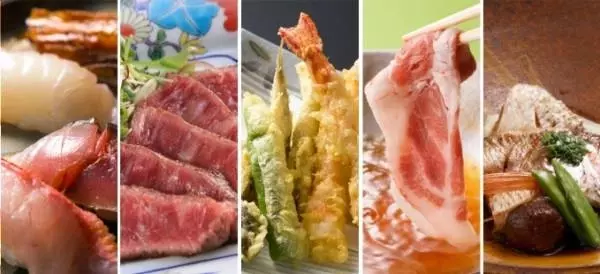 オーダービュッフェメニュー(一例):広島県産玉子を使った出汁巻き、広島県産豚肉の角煮、広島県産豚肉のすきやき小鍋、広島県産豚肉の豆乳しゃぶしゃぶ、広島県産鶏肉の天婦羅、広島県産豚肉の角煮どんぶり、合鴨ロース、海鮮サラダ、牛ロースステーキ、鯛の頭(塩焼き・酒蒸し)、蓮根と海老の挟み揚げ、天婦羅の盛り合わせ、本日の握り3種、茶そば、アイスミルクの天婦羅、今月の和菓子 など50種以上