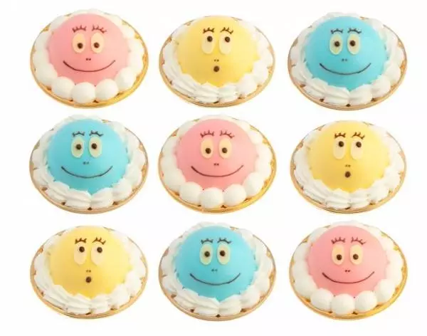 ピンク色の「バーバパパ ケーキ」は、赤桃のジュレ入り白桃ムース。イエローの「バーバズー ケーキ」は、チョコムースを閉じ込めたマンゴームース、ブルーの「バーバピカリ ケーキ」はブルーベリージャムを組み合わせたヨーグルトムースとなっている。