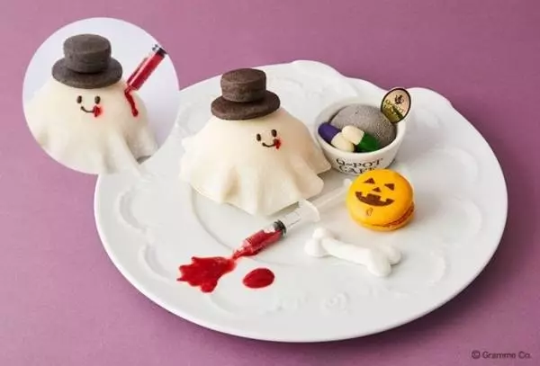 「オバケちゃん救急(QQ)治療プレート」は、Q-pot.の救急(QQ)病院に搬送されてきた、スイーツ中毒のオバケちゃんを主役にしたスイーツ。求肥とバニラムースでできたオバケちゃんケーキに、甘酸っぱいフランボワーズソースの注射をうって、治療してあげよう。プレートには、チョコレートのカプセルを飾った黒ゴマアイスと、骨型メレンゲ、カボチャフレーバーのジャック・オー・ランタンマカロンを添えた。