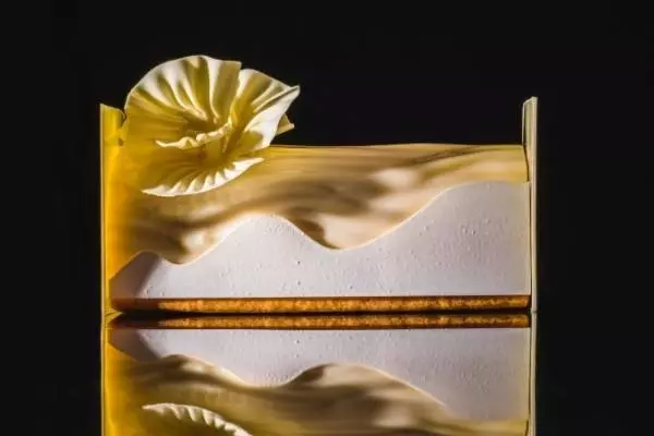 「ブッシュ トーキョー」は、上品なほろ苦さの宇治抹茶のムースとスポンジに、香り高く酸味の効いた柚子バタークリームを合わせた”和”なブッシュ ド ノエル。ローストした胡麻のサブレの香ばしい香りほんのりと鼻腔をくすぐり、抹茶と柚子の風味を引き立てる。純白のコサージュをあしらった繊細で美しい佇まいのケーキだ。