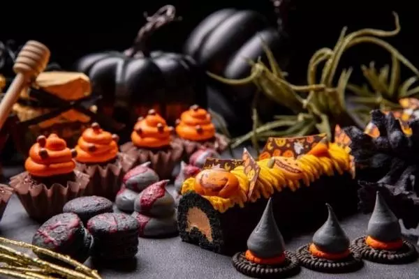 不気味で可愛いメニューには、ブラックココアを混ぜた真っ黒の生地でかぼちゃのクリームを包み、ジャック・オー・ランタンのチョコレートを飾ったロールケーキや、赤いチョコレートで返り血を表現したマカロン、クッキーの上にかぼちゃのクリームをのせ魔女の帽子に見立てたウィッチハットクッキーなどが揃う。