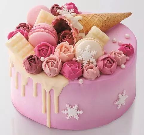福本美樹が手掛けるメイプリルでは、アメリカのアイスクリームをイメージした「ポプシクル」を用意。甘酸っぱいラズベリーチョコレートが入ったケーキの上には、コーンの中から溢れ出すマカロンや、フラワーモチーフのスイーツが飾られている。