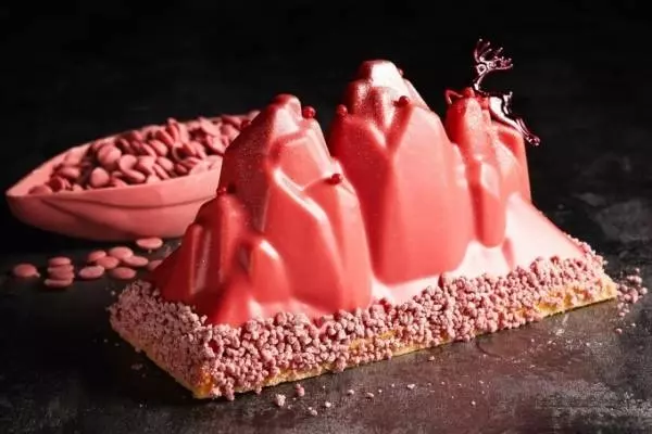 「ビュッシュ・ド・ノエル・ルビーショコラ」は、「第4のチョコレート」として話題を呼んでいる「ルビーチョコレート」をふんだんに用いたまるでアートのようなムースタイプのケーキ。まるで本物の雪山さながらの大胆なフォルムとは対照的に、ラズベリーのグラサージュの艶やかさが上品さを、そしてフルーティな香りを漂わせる。銀粉をあしらい、仕上げにトナカイを走らせた。