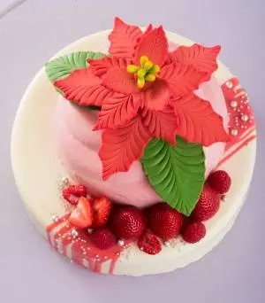 新作のプレミアムケーキ「クリスマス・ポインセチア」は、大きな「ポインセチア」を飾った2段のケーキ。手作りで丁寧に仕上げたチョコレート細工のポインセチアは、1葉1葉表情が異なる趣ある仕上がり。ホワイトチョコムースに、ドーム型のフランボワーズムースを重ね、苺やフランボワーズ、真っ赤なソースをあしらった。上段、下段ともに中にはピスタチオのクレームブリュレが入っている。