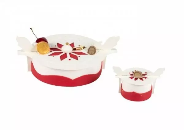 ビュッシュ & ビュシェット「タイン」は、ノルウェーの伝統的な木製ボックス”タイン”の形から着想を得たスペシャルなビュッシュ・ド・ノエル。マカダミアナッツのプラリネを挟んだ香ばしく濃厚なアーモンド・ダックワーズに、ライスプディング風のガナッシュや甘酸っぱいチェリーのコンポート、スパイスと華やかなローズ風味のムースなどを重ねた。