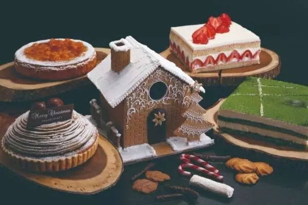 ジンジャーブレッドハウスと、世界4ヶ国を代表する4つのケーキを1度に楽しむことができるのはプレステージケーキ「クリスマスジャーニー」。地産地消にもこだわり、九州地方の素材を多く採用している。