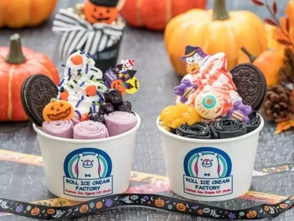 「ロールアイスクリームファクトリー(ROLL ICE CREAM FACTORY)」は、原宿・表参道本店、道頓堀店、堺北花田イオンモール店、名古屋・ラシック店の全4店舗で期間限定のハロウィンメニュー「ブラック・ハロウィン」「パープル・ハロウィン」を2018年10月12日(金)より発売。