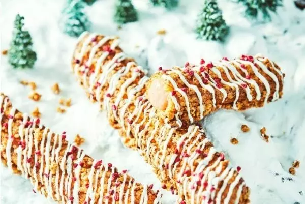 「ジングルベリーザク」は、アーモンドクランチベースのクロッカンをまぶしたシュー生地の上にホワイトチョコレートを掛け、フランボワーズのフリーズドライでトッピングしてクリスマスらしい色合いに仕上げた。なかには、ザクザク食感の生地にあわせて考案されたストロベリーカスタードクリームをたっぷり注入。やさしい甘みのホワイトチョコレートと甘酸っぱいベリーの組み合わせが楽しめる。