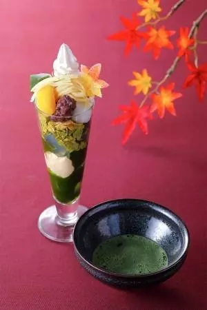 ベースは、「伊藤久右衛門」自慢の抹茶パフェ。抹茶の深みのある香りが感じられるスイーツに、鳴門金時いもや栗の甘露煮など秋の味覚を詰め込んだ。トップには、黄色からオレンジに変わりかけの紅葉型のゼリーを添えて。好みで別添の抹茶をかけて、味わうこともできる。