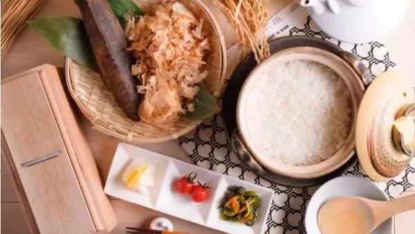 新米を使ったメニューとして、土鍋で炊き上げた新米に、鰹節の一番だしをかけて味わう「鰹節の一番だし茶漬け」を提供。日替わりの米の中から好みの銘柄を選ぶことができる。その他、旨味とコクの強い贅沢な地養卵を使用した「卵かけごはん」も用意。