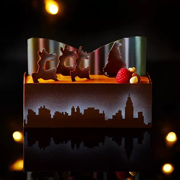 フィンランド語で"幻想"を意味する新作ケーキ「イリュージオ」には、オーロラが現れた都会の夜空を背景に、サンタクロースとトナカイがプレゼント届ける様子をデザインした。カラメルショコラのジェノワーズに、3種のショコラをブレンドしたクリームを合わせ、オレンジ風味の無糖クリーム、塩キャラメル、チョコレートコーティングアーモンドでアクセントを効かせた、大人の味わいとなっている。