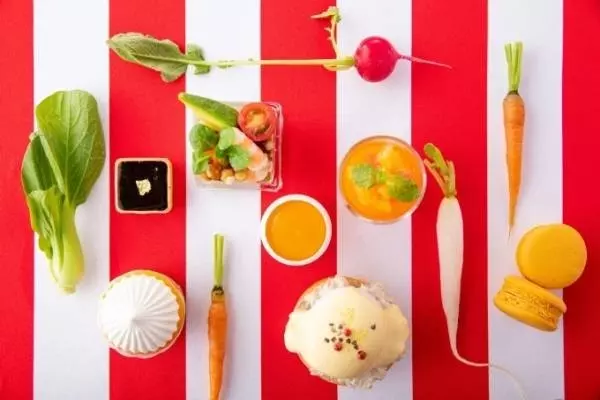 マヨネーズスコーン、マヨネーズクロテッドクリーム、紫の野菜とベリーのジャム、 玉ねぎのチョコレートタルト、ごぼうとマヨネーズのガトーショコラ、とうもろこしのカップケーキ、パッションフルーツのブランマンジェ、パプリカのマカロン、にんじんと柑橘のゼリー、天使の羽のマヨネーズとうがらしクッキー、シュリンプカクテル風サラダ、エッグス ベネディクト