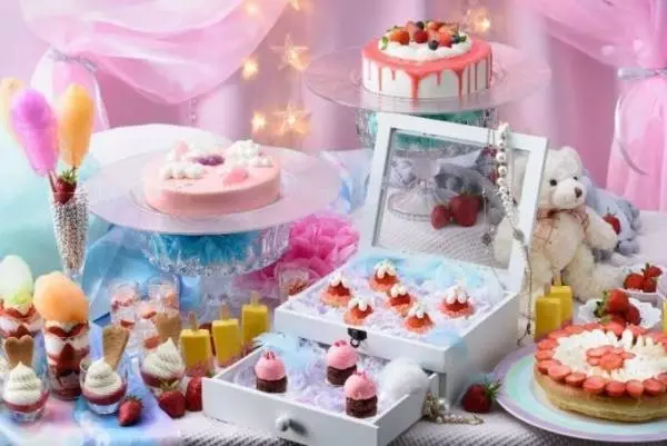 “ゆめかわ”な世界観をテーマにしたキュートな空間の会場では、童話に登場するような「いちごのショートケーキ」や「北海道練乳いちごタルト」といったパステルカラーのスイーツを提供。また、ビーフシチューなどのフードメニューも用意されるほか、ナイトタイムにはスパークリングワインが飲み放題といったポイントも。