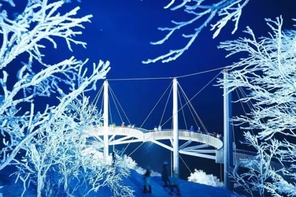 トマム山の標高1,088メートルに位置する「霧氷テラス」では、冬になると、木々に付着してキラキラとクリスタルのように輝く「霧氷」が楽しめる。期間中は、霧氷テラスにある展望デッキ周辺をライトアップ。光に照らされて美しく煌めく霧氷に360度囲まれ、神秘的なひと時を味わうことができる。