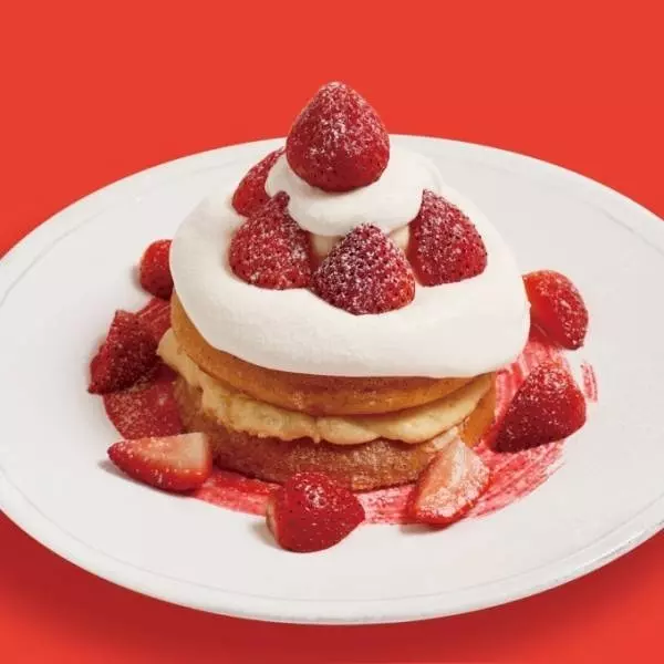 「クリスマス ミルキークリームパンケーキ」は、苺をふんだんに飾り、滑らかなミルキークリームをたっぷりとトッピングしたパンケーキ。ホールケーキのようにも見えるルックスはクリスマスにもピッタリだ。ふわふわもちもち食感のパンケーキには、バニラカスタードがサンドされている。