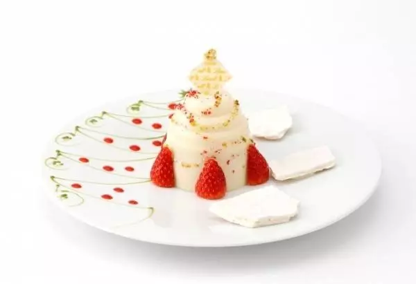 12月25日(火)までは、抹茶ホワイトチョコレートとストロベリーのソースでツリーを描いたプレートに、雪を模したメレンゲのデコレーションを施したクリスマスプレートで、12月26日(水)からは、ダークチョコレート、抹茶ホワイトチョコレート、ストロベリーの3種のソースでハートを描いたバレンタインプレートで提供される。