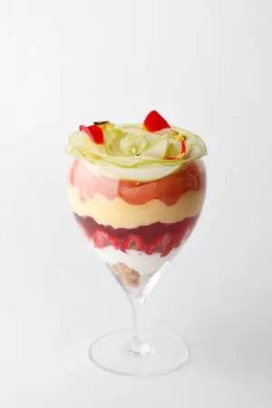 目を引くのは、リンゴで作られたバラの花。シロップ漬けにした青リンゴを、皮ごと薄くスライスし、1枚1枚丁寧に飾り付けた。また、透明のグラスには、ローズヒップゼリーやヴァニラクリーム、ラズベリー、マスカルポーネクリームを重ね、ボーダー柄のように見せた。甘みのある食材に酸味が合わさり、最後までおいしく楽しめるスイーツに仕上がっている。